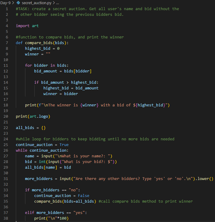 <Created a ‘Secret Auction’. Get bids from multiple users without showing the previous user what the last bid was. Once all bids have been made the highest bidder is printed as the winner. >